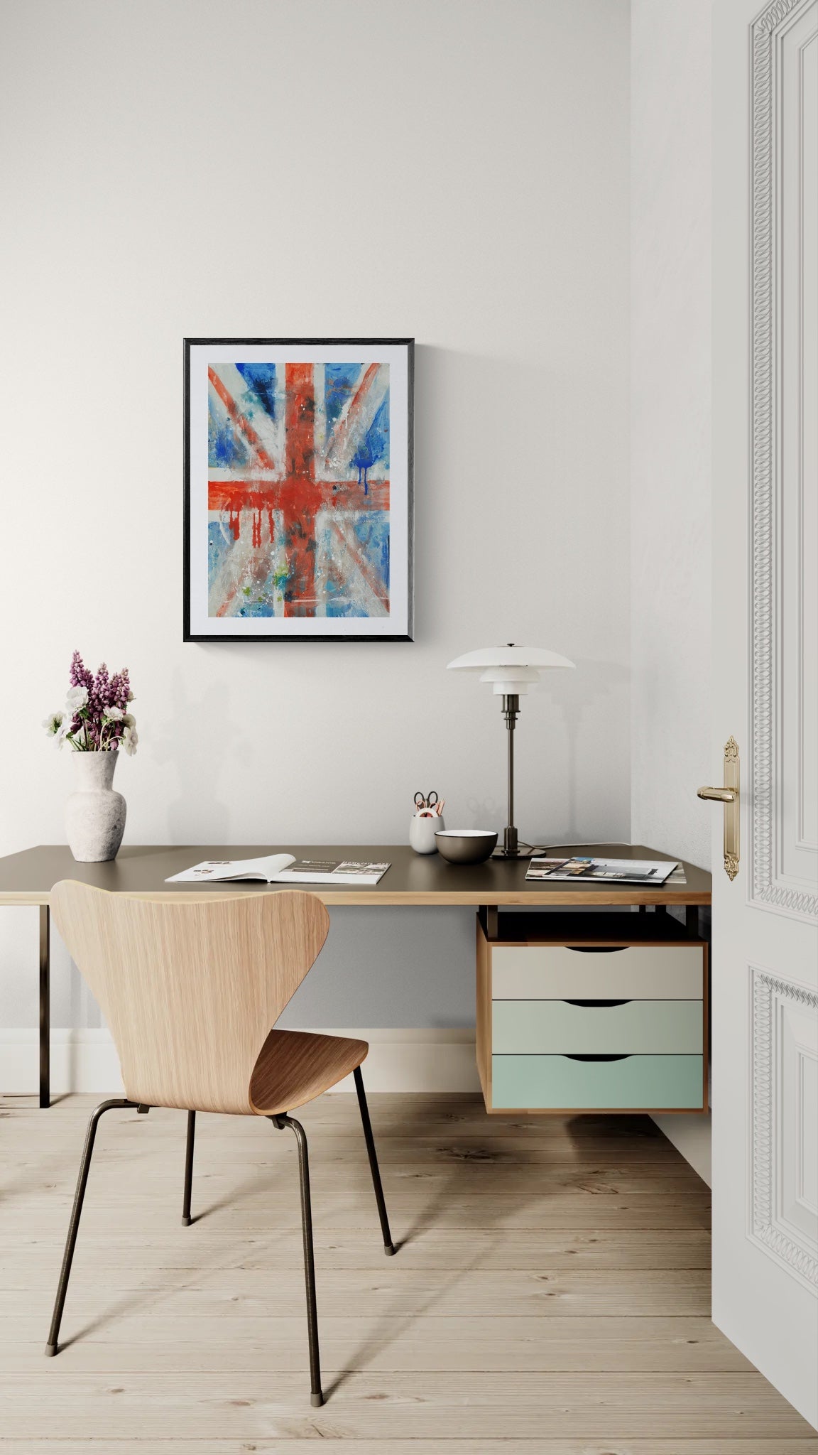 Inspired by the Covid-19 lockdown in England, this mixed-media painting reflects a period of uncertainty, isolation, and quiet endurance. Abstracted elements of the Union Jack appear fractured and partially dissolved, suggesting national identity under emotional and social strain.