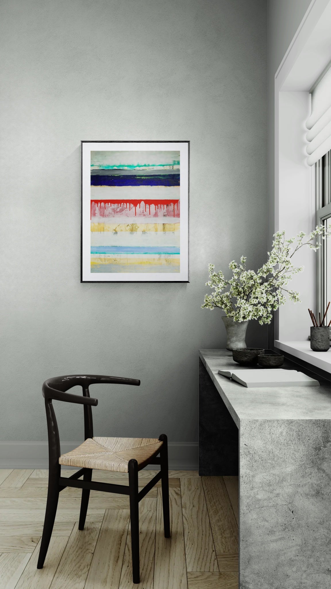 This is an unframed work on cotton rag paper; acrylic with a small amount of crayon work. It has a great retro/vintage vibe, much sought after these days. "I really enjoy working this way with the stripes, the colours reflect my mood". Signed on the front and back. Just a note to say for framing; it can be framed with or without a mount and with the staple holes at the edges on show or hidden.