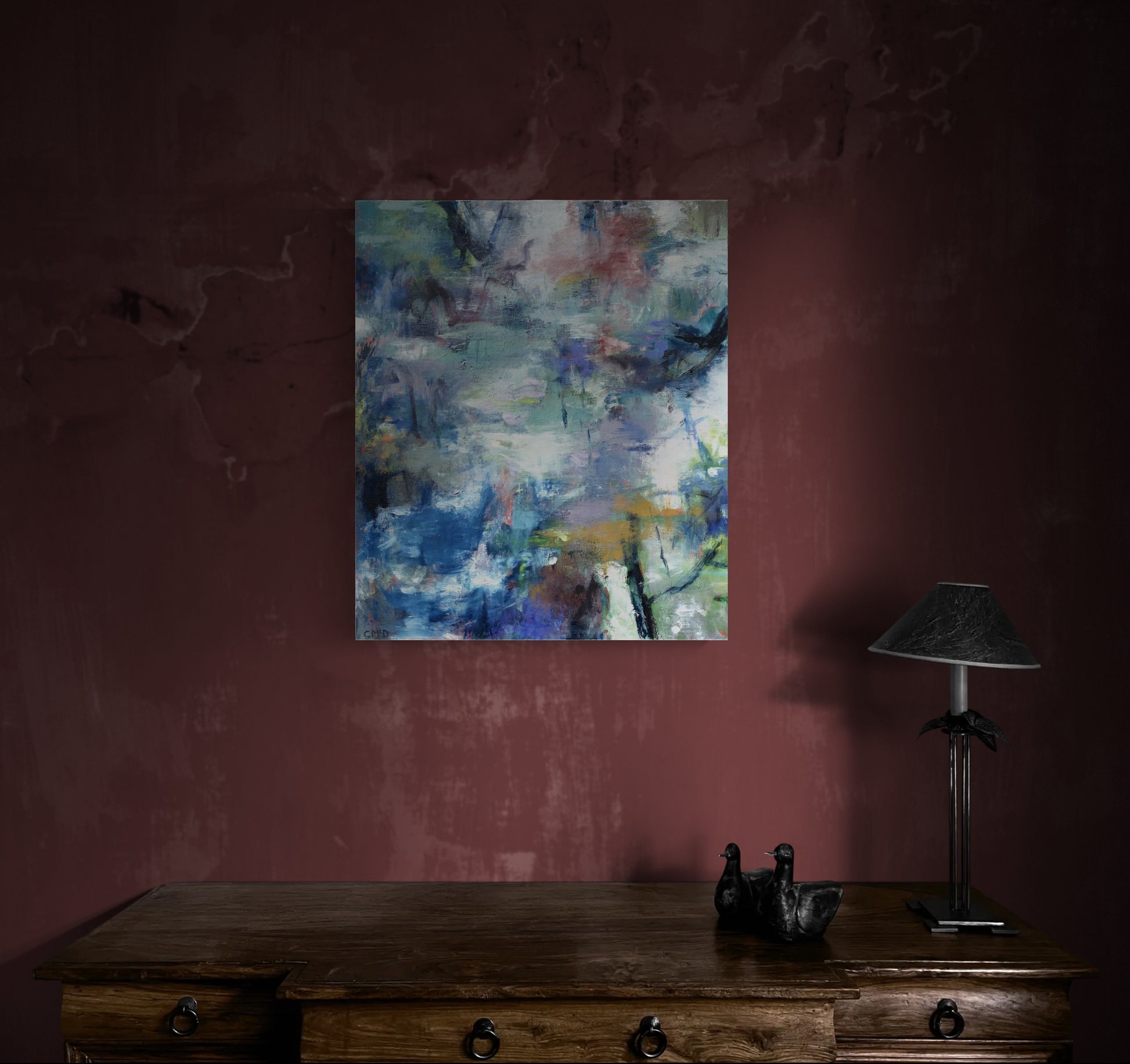 Summer by the beck is inspired by the flowing water, reflections, and colour found in the Cumbrian fells. I often sit beside this beck, letting the rhythm of water and shifting light guide my brush. Painted in oil with expressive marks, this piece captures the constant motion of the landscape — where stone meets stream, and sky shimmers in the surface below. Turquoise, blue, and green ripple through the painting, with flashes of light evoking sunlight on wet rock and foliage. This is both a place and a feeling — a landscape in motion, held just long enough to witness it. As an artist, I believe places carry stories. Tarn Rigg Beck tells one in colour and texture — inviting the viewer not just to look, but to listen.