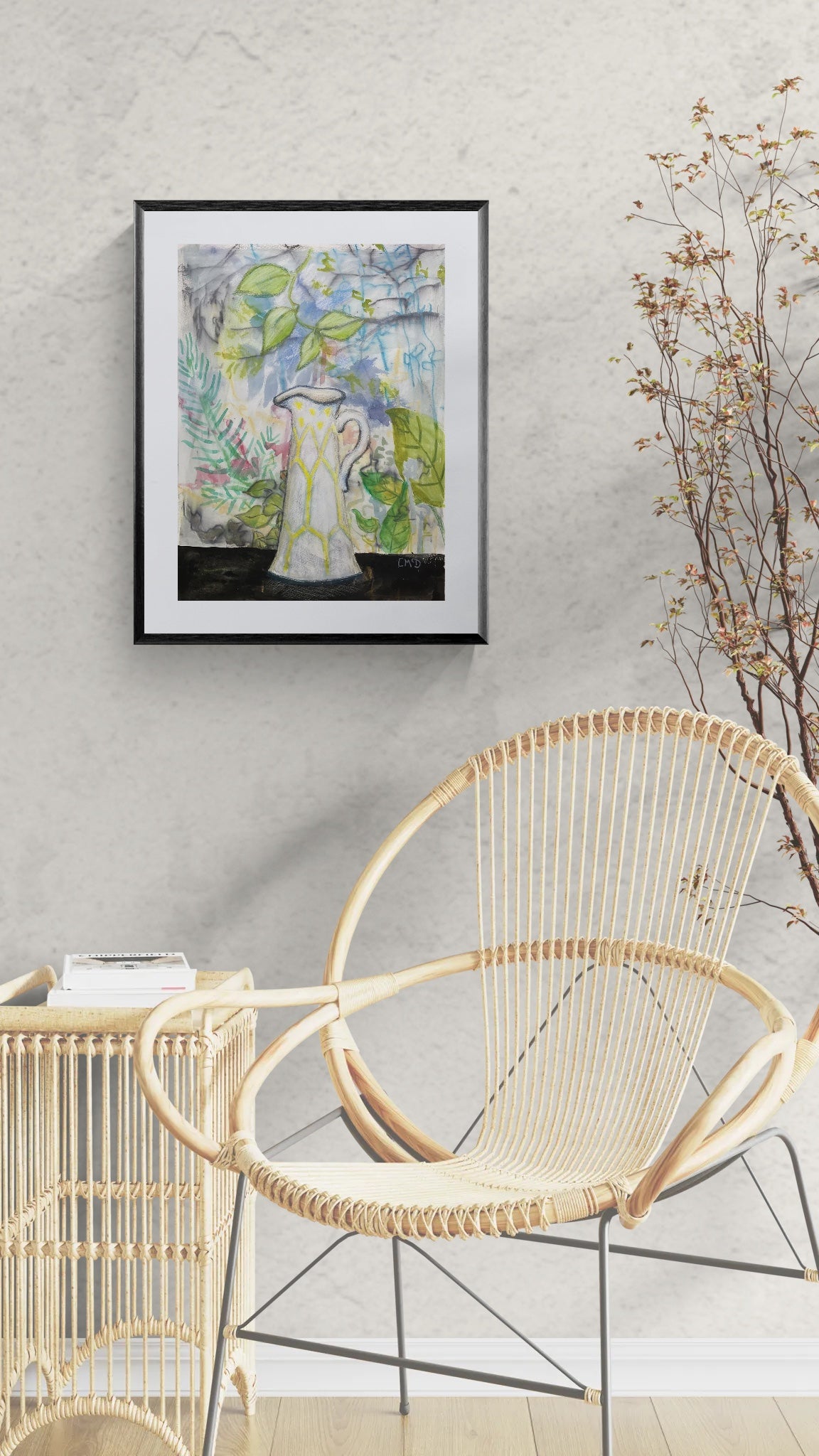 Luminous and refreshing, this original watercolour, gouache, and pencil work on cotton rag paper captures the quiet elegance of a simple jug set against a lively botanical backdrop. Vibrant greens and cool washes of blue surround the vessel, evoking the energy of ferns and foliage swaying in dappled light. The jug’s delicate yellow pattern adds a subtle warmth, grounding the composition with grace and balance. Both modern and timeless, this artwork offers a tranquil yet uplifting presence—perfect for bringing a touch of nature’s serenity into any interior.